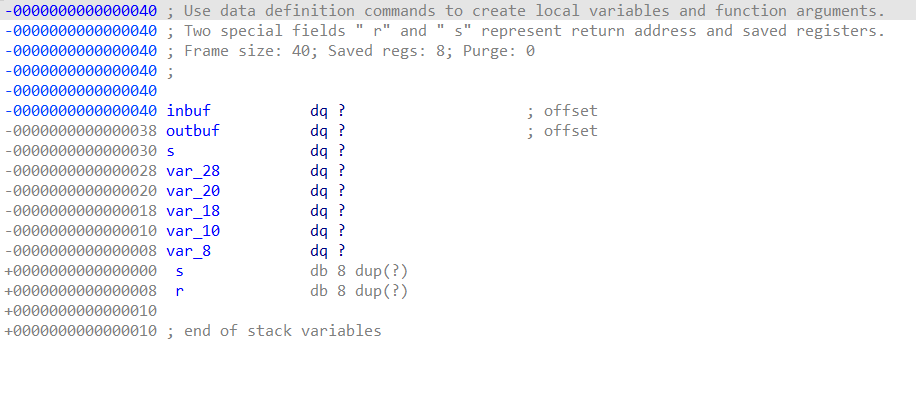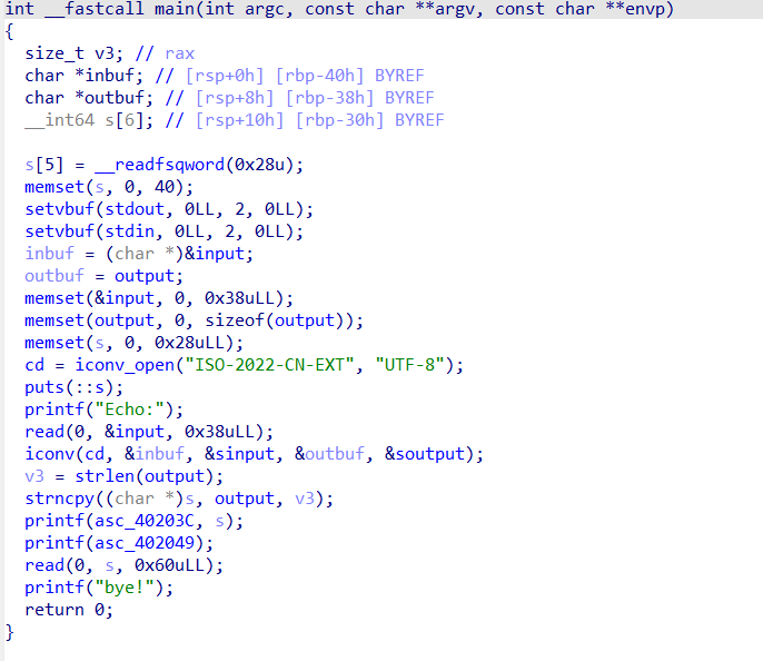 64位程序开了canary保护,最后有个明显的往s里读0x60字节的栈溢出,那么我们就要想办法先得到canary的值。我们发现canary实际存在var_8处,而最后iconv函数实际对输入进行换编码后会存0x26字节到s中,s与canary之间只差0x28个字节,那么我们利用iconv的漏洞,先填充0x25个垃圾字符,最后写一个会触发漏洞的字符,就可以溢出3字节刚好把canary低位的00给覆盖了,那么printf("%s",s)就能直接把canary的值打印出来了。