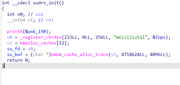 漏洞模块首先注册了一个meizijiutql 的字符设备,我们可以从/dev/meizijiutql 进行访问与交互。