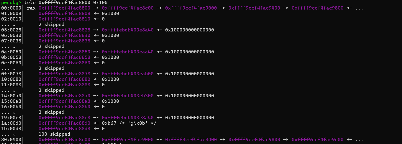 之后的利用思路就是依靠堆溢出,改一些free掉的chunk的fd位,然后就能分配chunk到我们想要的地址,实现任意地址写。比如我们申请一个0x400的堆块,然后看到有如下布局。后面紧跟着的就是下一个申请位置的fd 域。这里主要涉及到slub 堆分配器的原理,我们后面再进行详细学习,这里我们大概知道堆溢出劫持该fd域就能实现任意堆块分配就行。