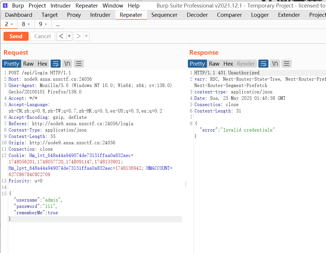 credentials,这里猜测用户就是admin,弱口令爆破密码得到密码为password,点登录拿到flag