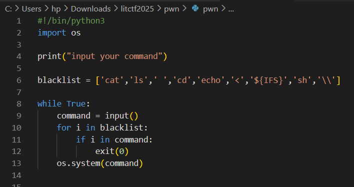 签到题,给的附件是一个python脚本,可以直接RCE,只是过滤了一部分命令。