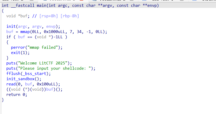 这道题和ACTF的有道题类似,都是只允许open和read系统调用,但对shellcode本身没有做什么限制,所以可以打一个时间侧信道攻击,去比较读取到的flag的某一位是否与我们指定的值相同,如果相等就进入死循环,否则让程序直接EOF退出。这里存在的一个问题是我们需要一个可写的地址来存我们读取到的flag,由于程序开了PIE也没其它别的漏洞,所以这里我们可以采用call+pop 的方式来获取到我们可写可执行区域的一个相关的地址,call可以把当前指令的下一个地址入栈,然后pop可以把这个地址赋值给某个寄存器,从而实现得到一个可写的地址,加上一个偏移就可以确保其不会覆盖我们要执行的代码。