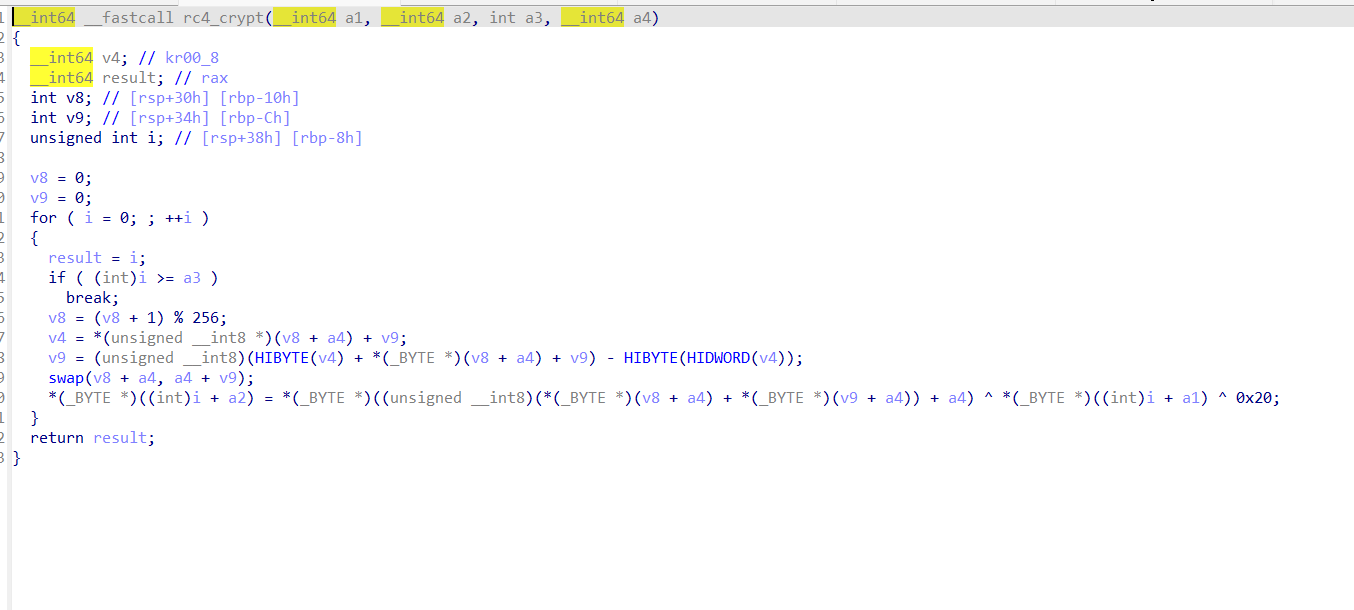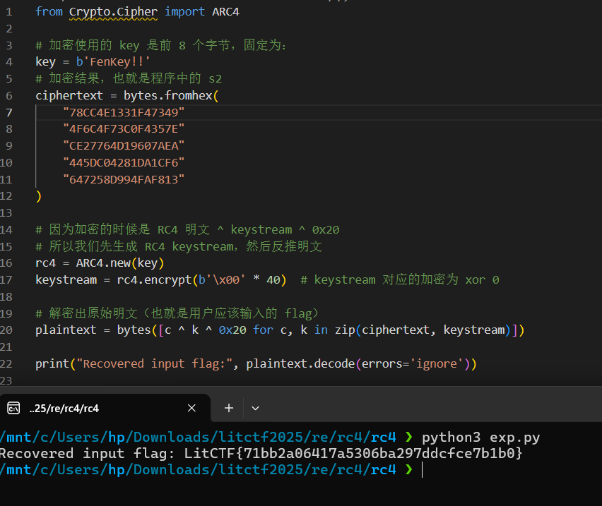 分析rc4_crypt发现,其相对于普通的rc4加密,最后还多异或了一个0x20,那么这就是一个经简单魔改的rc4加密,可以直接生成keystream,然后异或时除了异或keystream对应位以外,还需要多异或一个0x20回去。rc4解密可以直接调用python的ARC4库实现。