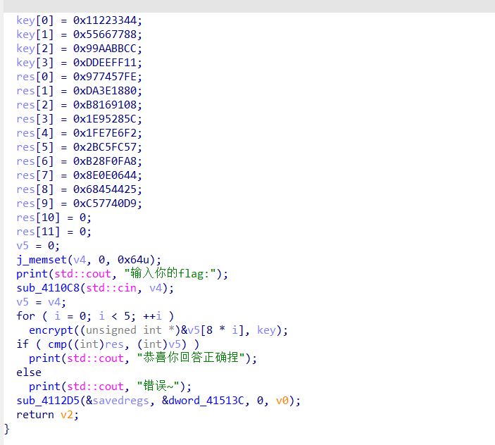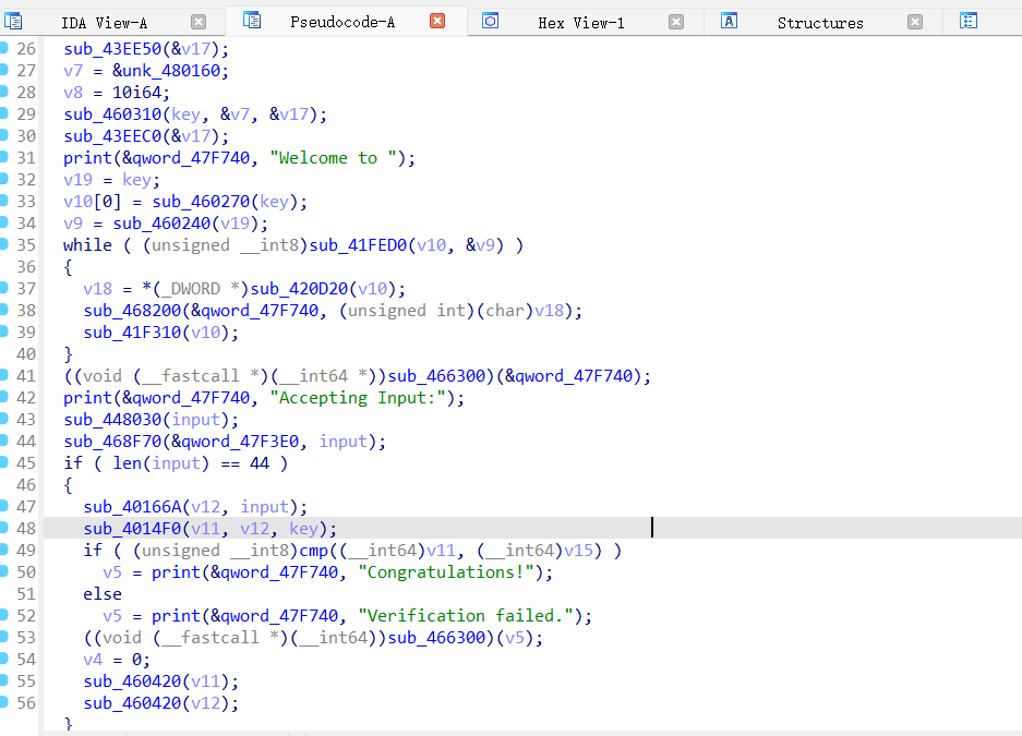 首先定位到最后验证flag的逻辑,flag长度44,是和v15处的内容进行比较。v11存的是加密后的输入值。前面加密用到了两个函数,其中第二个函数用到了一个前面生成的一个key值。