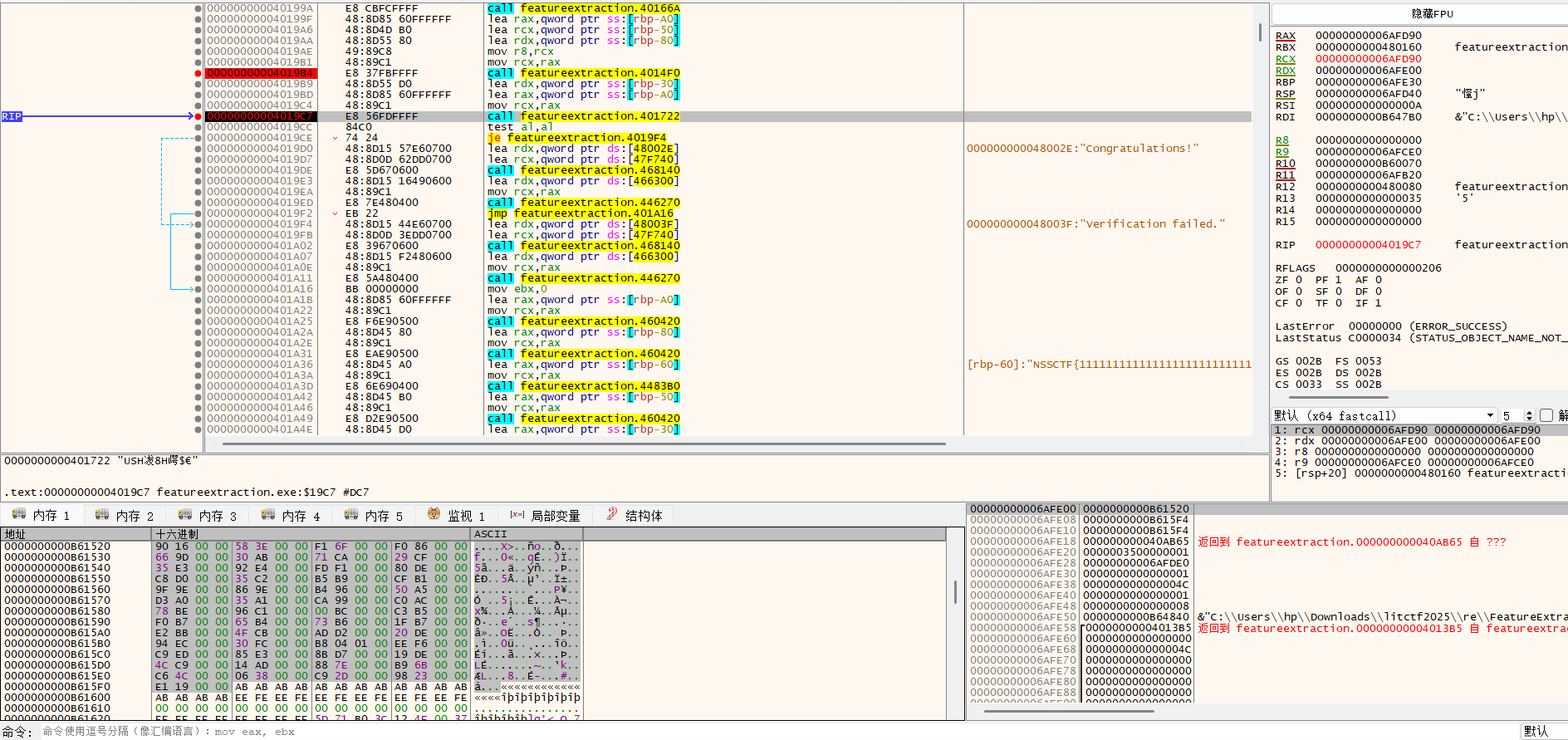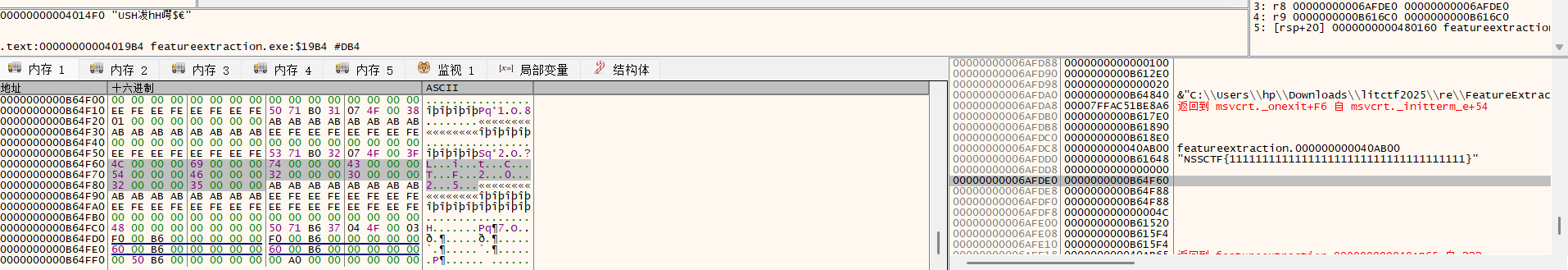 实际上我们v15的值和key的值都可以在动态调试中直接dump下来。比如我们可以打个断点在这个用到第三个参数作为key进行加密运算的函数处,这里第三个参数是用r8传递,此时值为0x6AFDE0,然后可以再右下角栈帧中找到这个地址,然后在内存窗口定位到该地址处存的地址。可以看到存的key是LitCTF2025,可以发现这里都是用四个字节存一个值。