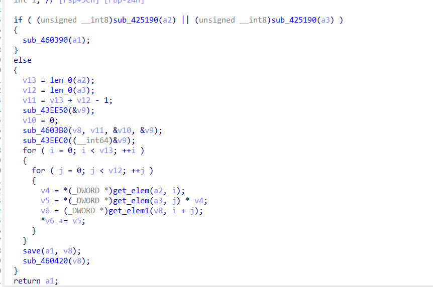 然后我们仔细分析sub_4014F0这个加密函数大概干了什么(前面那个函数经分析没啥用处,大概是将输入的格式统一一下)。这里v13和v12大概是输入与key的长度,然后在循环里主要是把input[i]和key[j]乘起来,最后累加到v8数组的i+j下标处。经gpt分析说是典型的多项式乘法,i+j就相当于多项式的某个次数,最后我们返回的值实际上就是v8数组。
