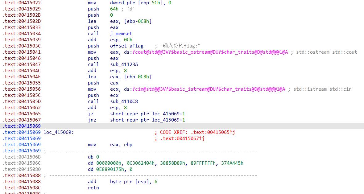 首先进IDA一看不能直接解析成函数,具有花指令,这里由于花指令数量不多,我就全部手动patch了。第一种是经典的jz和jnz组合,实际上就是直接跳转到指定的地址处,可以把jz,jnz以及跳转地址之前的内容全部nop掉。