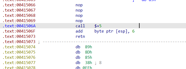 第二种是call+ret的花指令,首先call进去把下一个指令的地址入栈,然后修改(+6)栈顶的这个返回地址,最后再返回回去,实际上就是直接执行call后面一个指令地址+6处的内容,前面的可以全部nop掉。