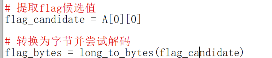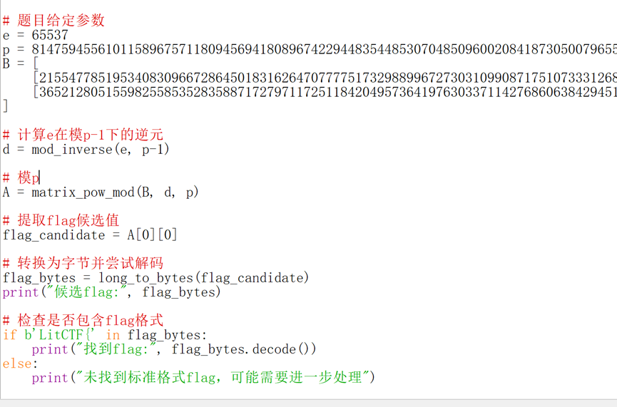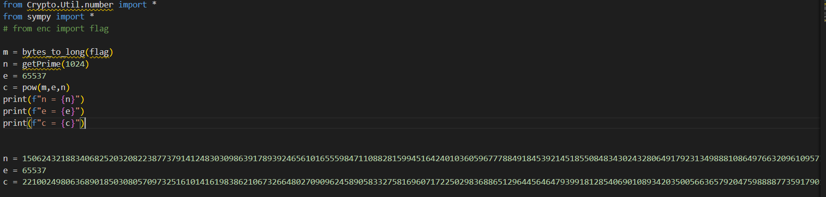 1 2 3 4 5 6 7 8 9 10 11 12 13 14 15 16 17 18 19 20 21 22 23 from Crypto.Util.number import *from sympy import *n = 150624321883406825203208223877379141248303098639178939246561016555984711088281599451642401036059677788491845392145185508483430243280649179231349888108649766320961095732400297052274003269230704890949682836396267905946735114062399402918261536249386889450952744142006299684134049634061774475077472062182860181893 e = 65537 c = 22100249806368901850308057097325161014161983862106732664802709096245890583327581696071722502983688651296445646479399181285406901089342035005663657920475988887735917901540796773387868189853248394801754486142362158369380296905537947192318600838652772655597241004568815762683630267295160272813021037399506007505 phi_n = n - 1 d = mod_inverse(e, phi_n) m = pow (c, d, n) flag = long_to_bytes(m) print (flag)