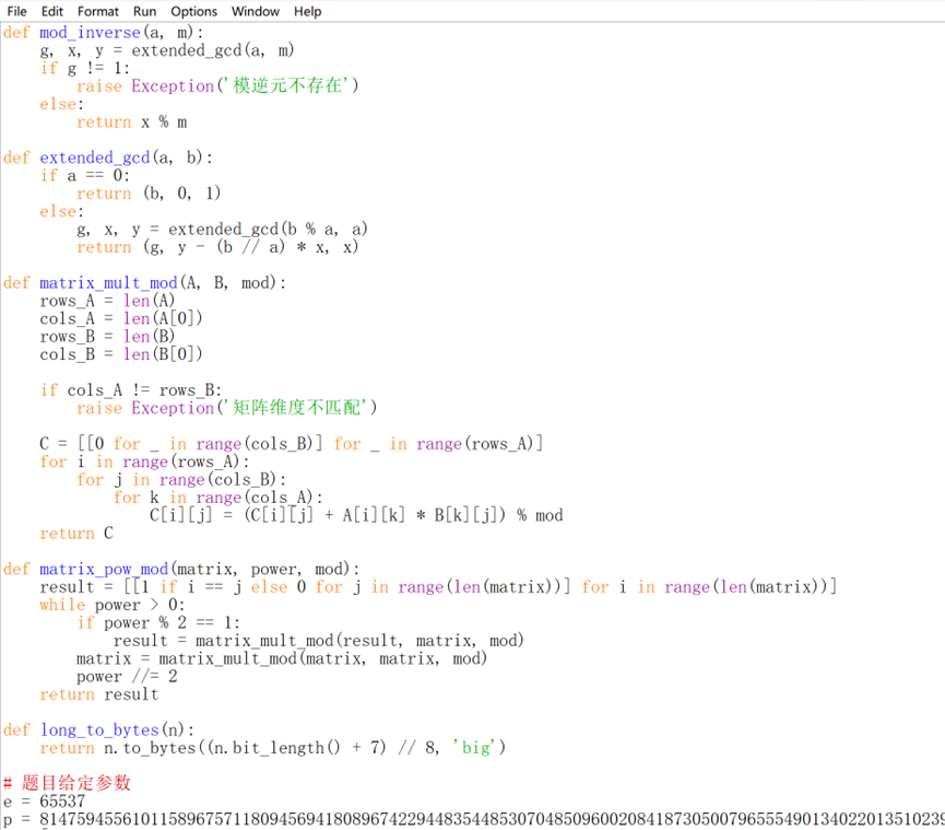 题目中使用了 2x2 矩阵 A 在有限域 GF (p) 上进行幂运算,得到矩阵 B =