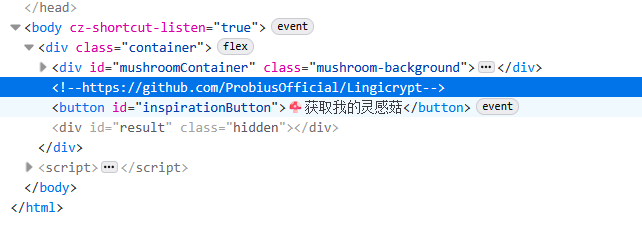 "cipher"。点击页面的按钮可以得到灵感菇编码的内容,用脚本解码即可。
