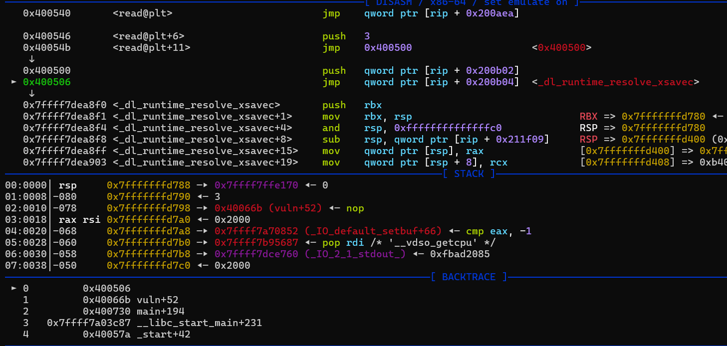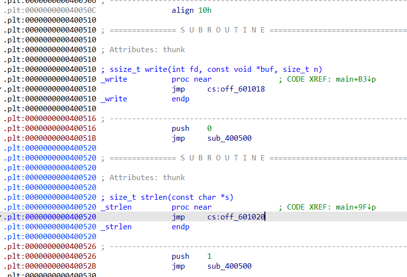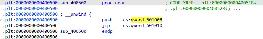 而.plt 段则存着plt 表,其中每个函数的plt都有两个jmp ,我们调用所有函数都是来到第一个jmp处,然后跳转到对应got表位置存的地址处。在一个函数都还没被调用时,got表里存的就是对应同一个函数的plt表里的第二个jmp前push的地址。所以实际上第一次调用某个函数是由第二个jmp跳转到后续的解析函数(这里是0x400500)。这里看到前面push的数字正好是按照函数在plt中的顺序递增的。而0x400500 处也是push一个地址并跳转到另一个地址处。