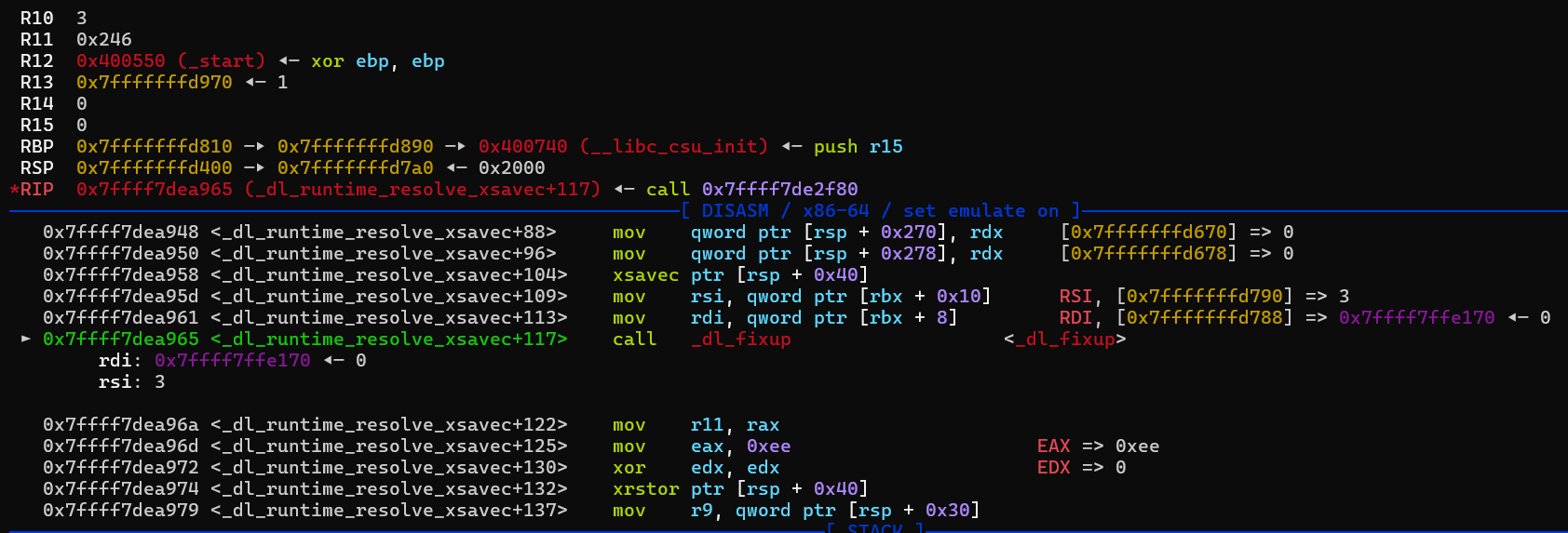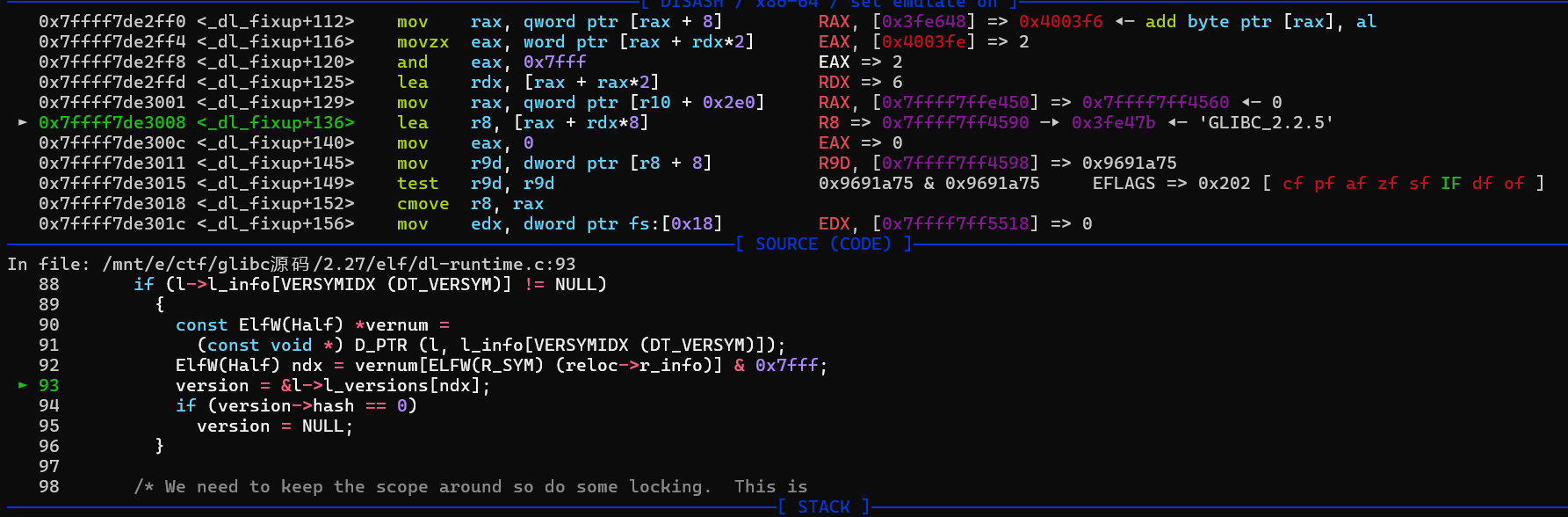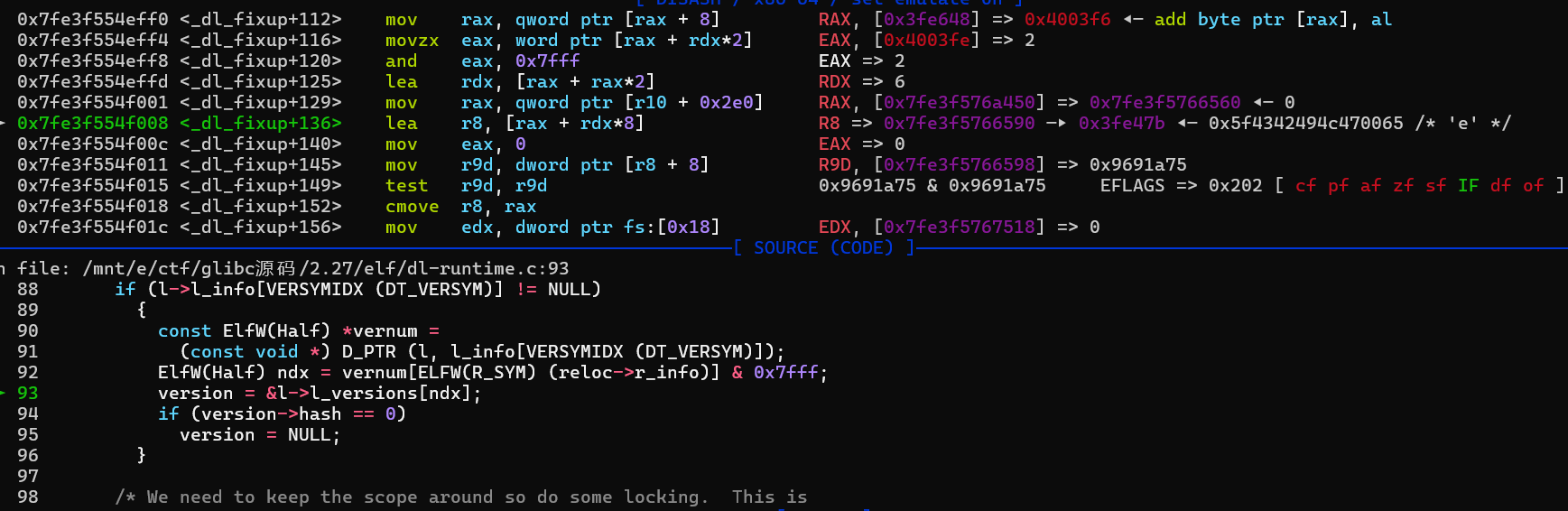 在gdb调试中,我们可以看到最后会跳转到**_dl_runtime_resolve_xsavec->_dl_fixup函数链进行解析。进 dl_fixup时的两个参数就是之前push到栈上的序号以及一个libc里的地址( link_map**地址)。