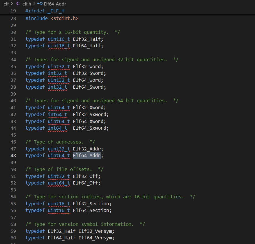 而在elf/elf.h 中,我们就可以看到Elf64_Addr 实际就是一个64位的无符号整型。