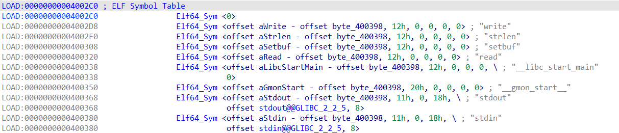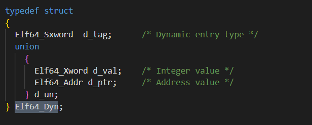 1 2 3 4 5 6 7 8 9 typedef struct { Elf64_Word st_name; unsigned char st_info; unsigned char st_other; Elf64_Section st_shndx; Elf64_Addr st_value; Elf64_Xword st_size; } Elf64_Sym;