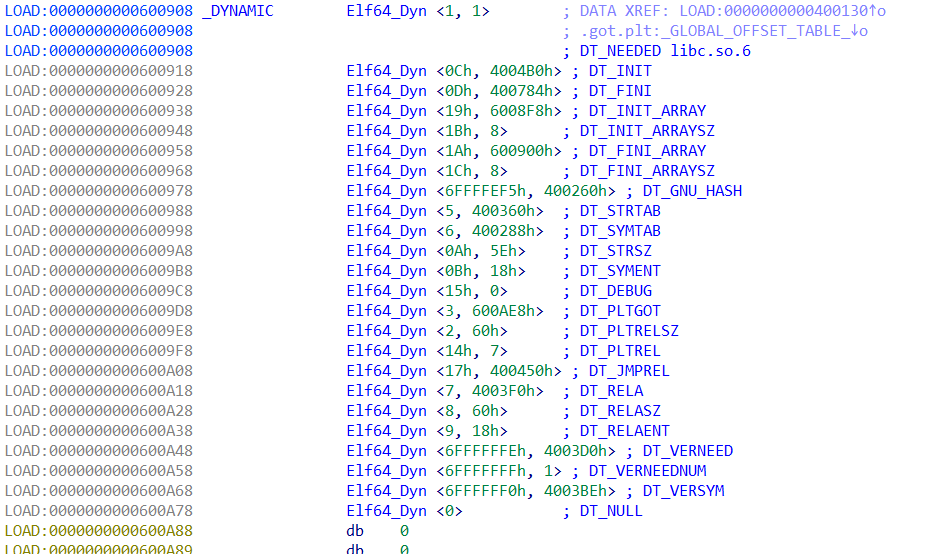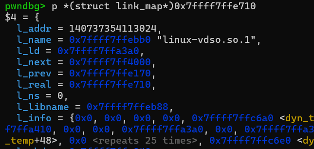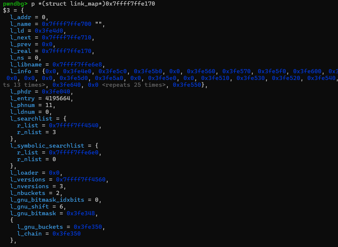 1 2 3 4 5 6 7 struct link_map { ElfW(Addr) l_addr; char *l_name; ElfW(Dyn) *l_ld; struct link_map *l_next , *l_prev ; };