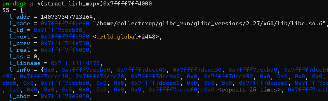 调试时看到的对应结构体远比上面的结构体定义复杂,不过前几个字段还是对的上的,发现第一个next域指的很近,实际使两个link_map重叠了。我们可以跟着next域打印几个link_map 链表结点看看。
