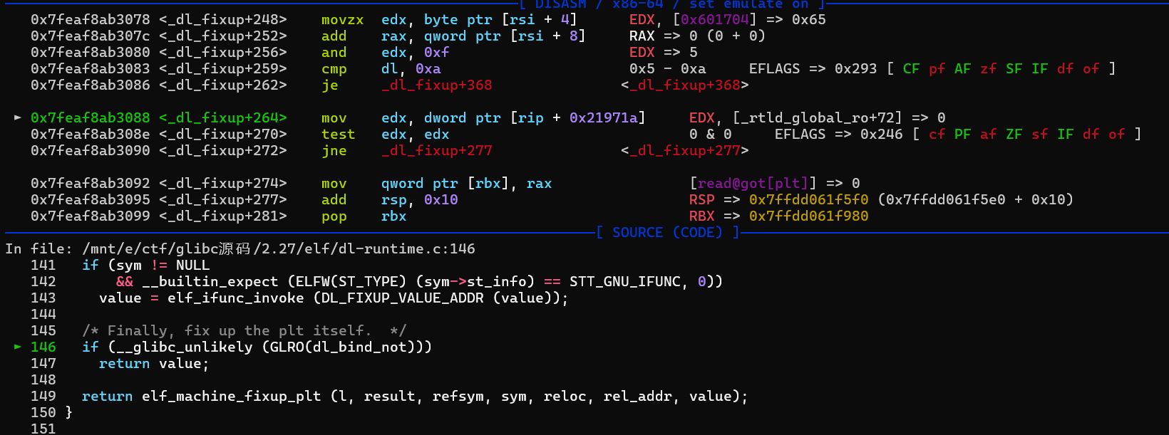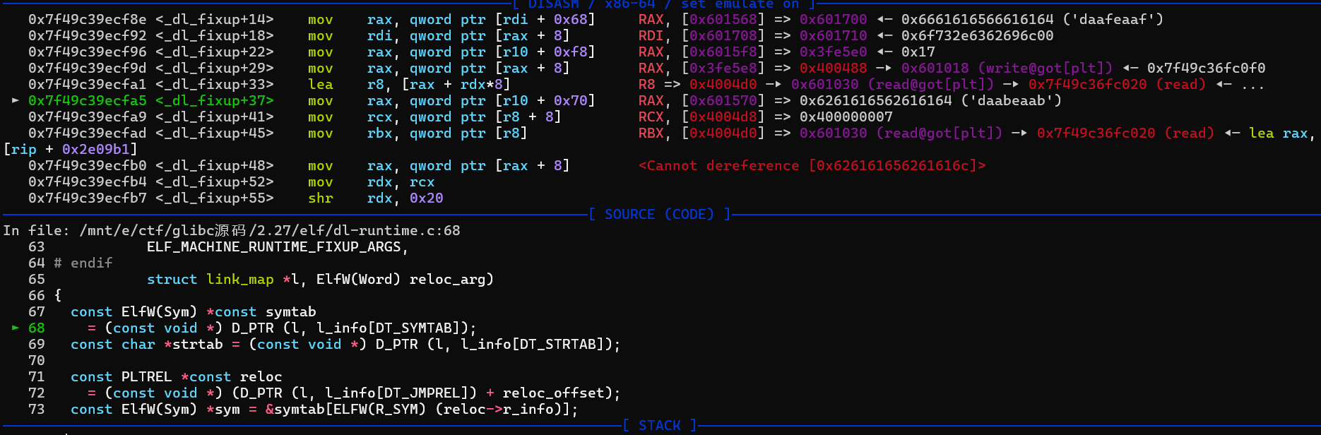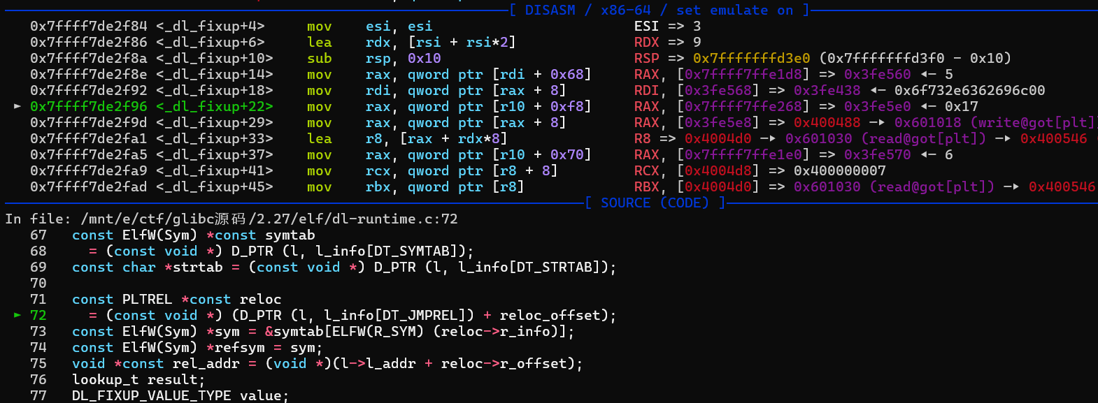 RELRO 下dynamic节不可直接改写,所以要借助其它方式来利用。首先我们重温一下dl_fixup 的流程,以write调用为例,一开始我们可以发现可以定位到ELF