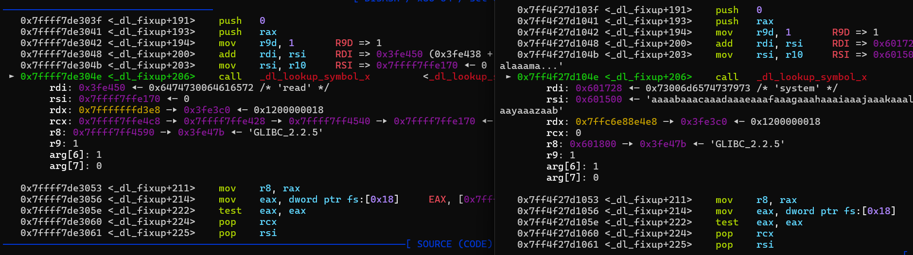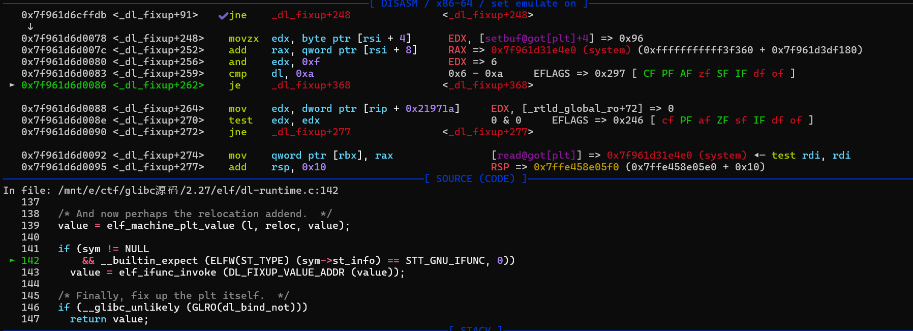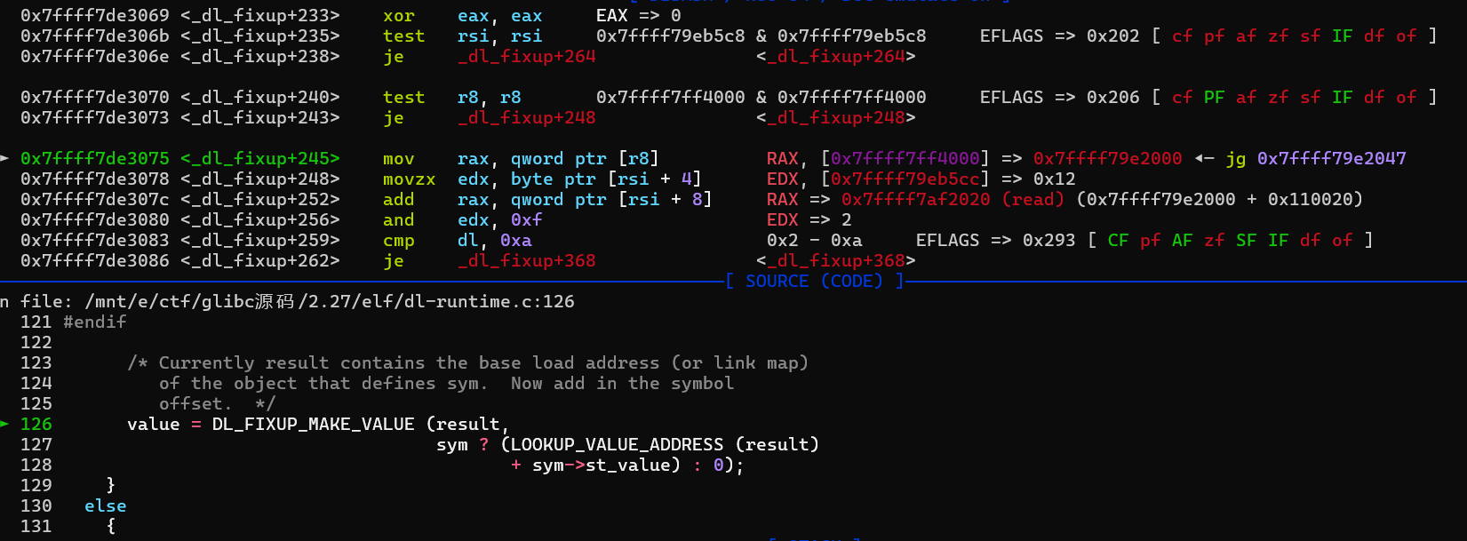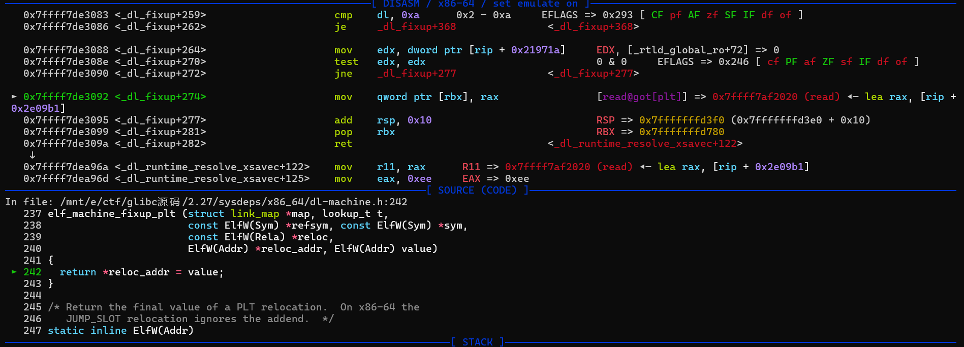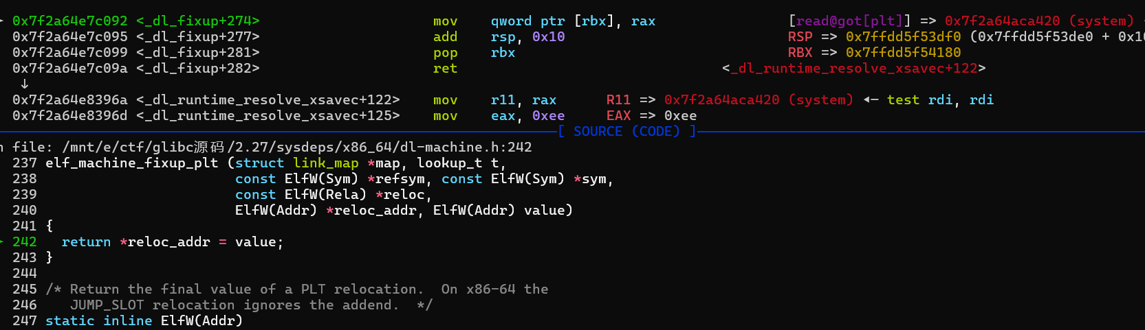 1 2 3 4 5 6 7 8 9 10 11 12 if (__glibc_unlikely (GLRO(dl_bind_not))) return value; return elf_machine_fixup_plt(l, result, refsym, sym, reloc, rel_addr, value);elf_machine_fixup_plt (struct link_map *map , lookup_t t, const ElfW(Sym) *refsym, const ElfW(Sym) *sym, const ElfW(Rela) *reloc, ElfW(Addr) *reloc_addr, ElfW(Addr) value) { return *reloc_addr = value; }