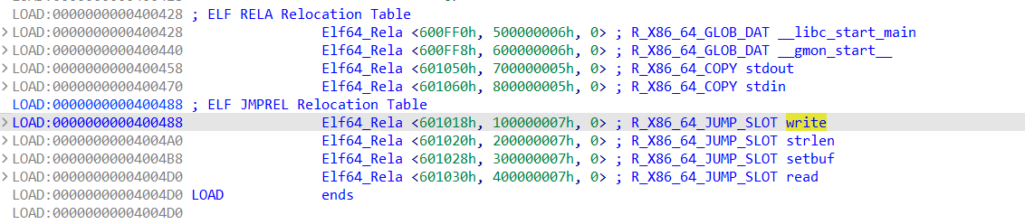 其中ELF64_Rela结构体定义如下,其中sym的偏移在r_info 的高4字节处,那么可以看出write的sym偏移为1,read的sym偏移为4: