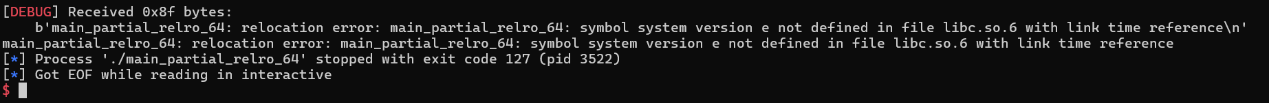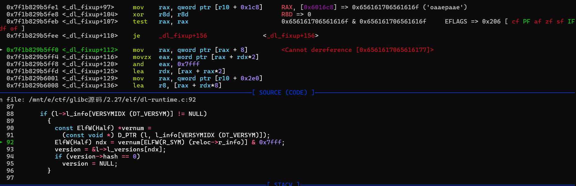 可惜的是最后有如下报错,那我们跟进去dl_fixup 看看是具体哪里出了问题。报错说是e不是一个symbol