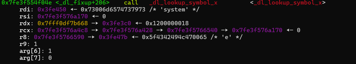 需要伪造的link_map 结构体比较复杂,这里可以尝试结合动态调试把用到的字段填充。比如一开始这里获取symtab,根据正常运行时的结果,我们伪造link_map 的偏移0x68处是一个地址A,A+0x8处存着字符表指针,那我们可以把这个位置指向我们可控的地址,其偏移8处为我们伪造的字符表;而偏移0xf8处可以直接填入0x3fe5e0 (可见之前的图,理论上也可以自己伪造),复用程序的ELF