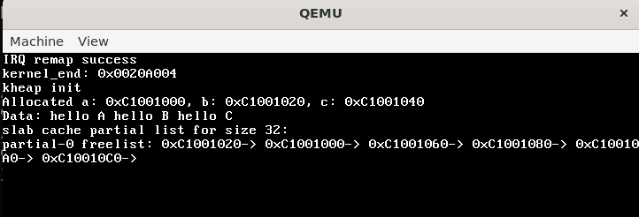 这里在kernel_main里写几个测试堆分配的函数,调用这些函数看看堆管理的基本行为是否符合预期。